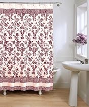 Toile Fabric Shower Curtain - Burgundy Ooh la la! Find some French inspiration for your bathroom decor with this exquisite Toile fabric shower curtain shown here in a striking burgundy and white color combination. Inspired by classical French toile de jouy the body of the shower curtain features an allover design of stylized leaves and flowers bordered top and bottom with a complementary hounds tooth pattern. The standard size 70-by-72 inch shower curtain is constructed of an easy care blend of 55% cotton and 45% polyester and is machine washable. The Toile fabric shower curtain sells for $19.99 in better department stores and upscale specialty chains!
